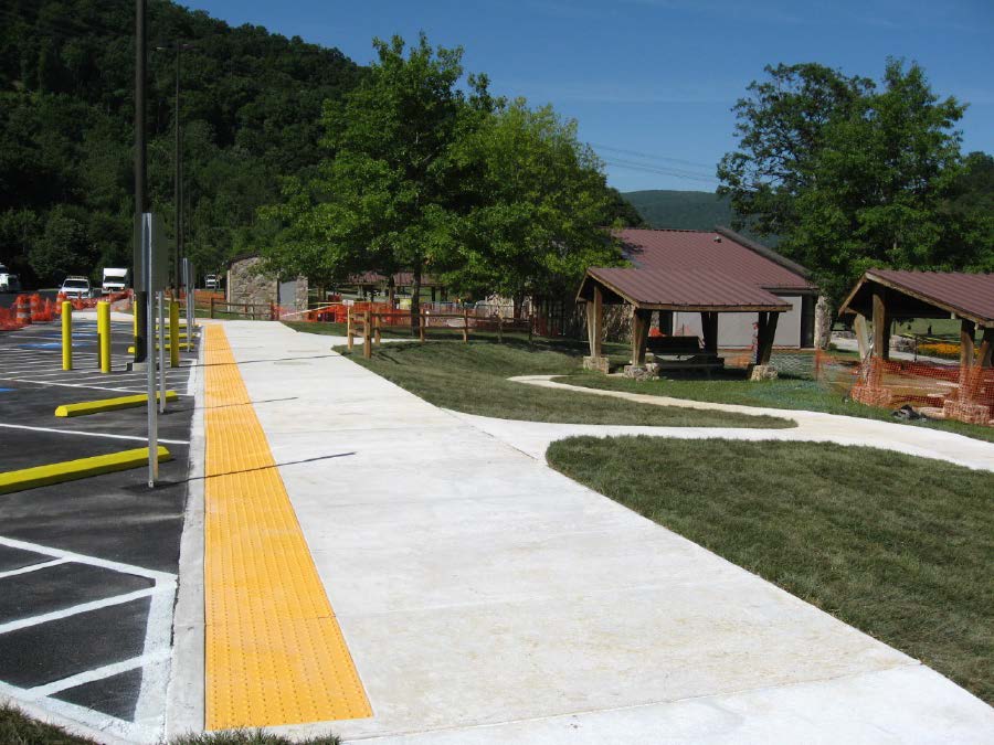 The northbound Rocky Gap Safety Rest Areas had assets that did not meet current American with Disabilities Act standards for walkway slopes and grades including: handicap parking, access isles, sidewalk ramps, and portions of the sidewalk going to several picnic shelters and a service center. Fixed assets with limited space and varying elevation changes posed a challenge to meet ADA standards for walkways and parking without the addition of handrails.